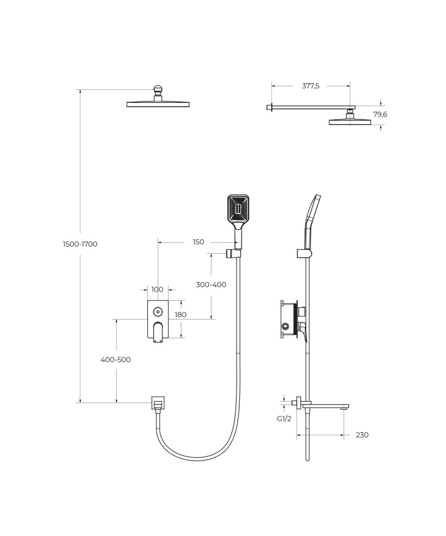 DUE Душевой комплект встраиваемый с изливом (смеситель встраиваемый, верхний душ, ручной душ со шлангом, штуцер с держателем), хром DUE-VDSET-CRM