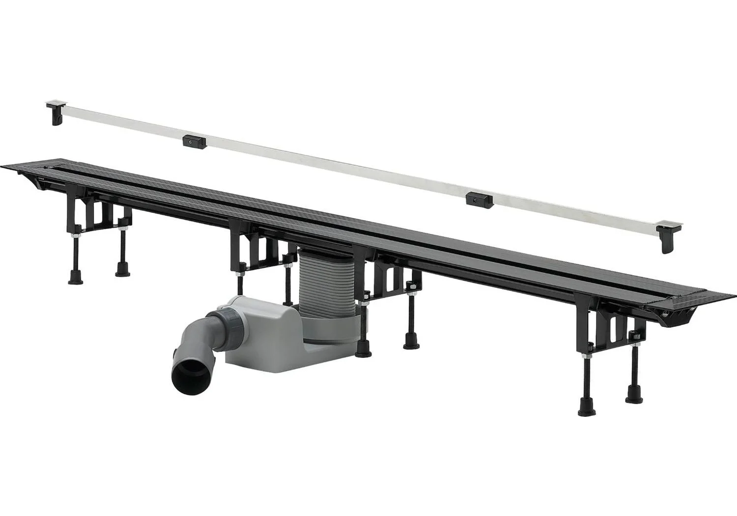 • комплектация: монтажные опоры, торцевые заглушки, сифон с функцией самоочищения, регулируемое по высоте крепление для дизайн-вставки, компенсатор высоты, фланец для нанесения/закрепления гидроизоляции, набор уплотнений, шаблон для укорачивания