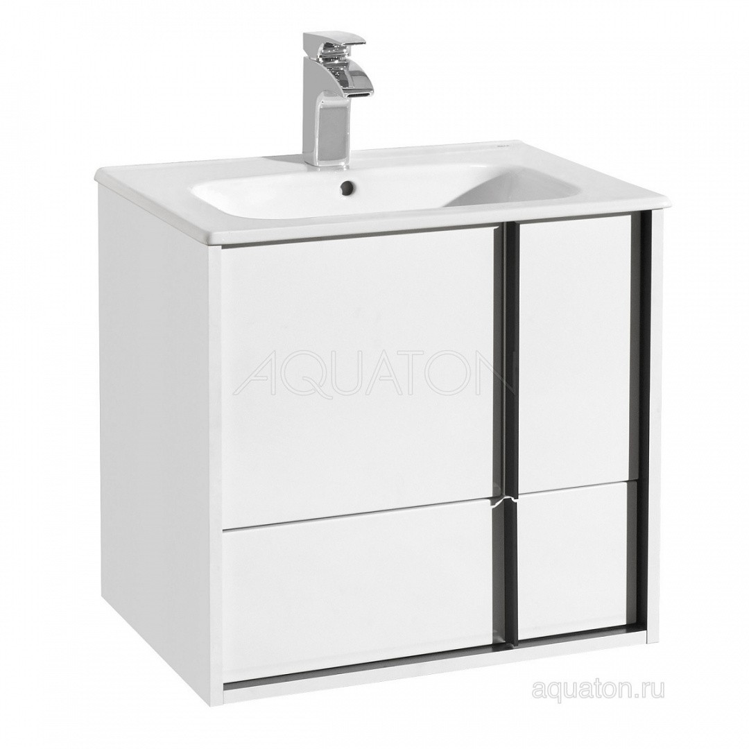 Модель Акватон Ривьера 60 имеет два выдвижных ящика и один распашной. Внутренние отделения тумбы выполнены в черном цвет. Для комфортного использования тумбы оснащены системой плавного закрывания.