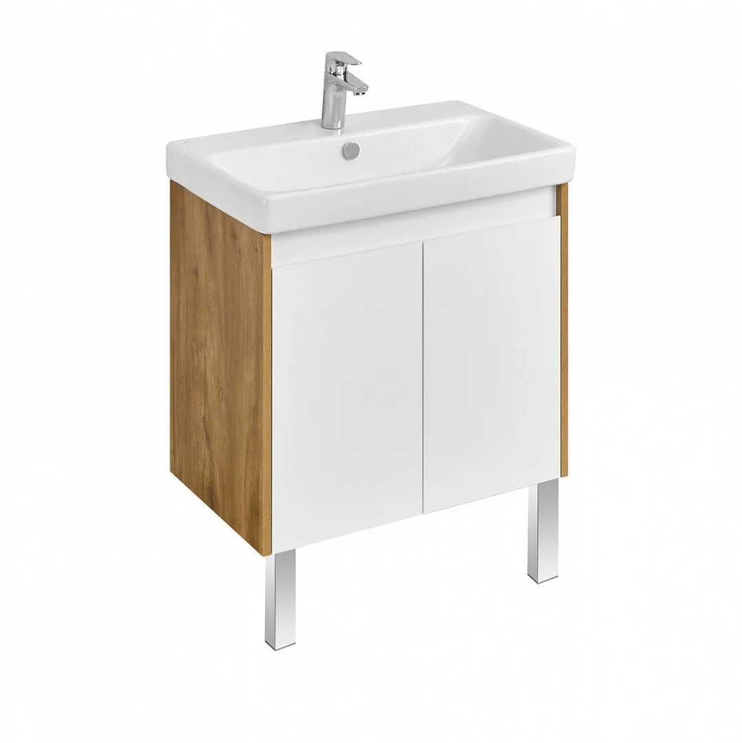 Корпус тумбы выполнен из влагостойкой ЛДСП в декоре натурального дерева, а фасады-створки в белой глянцевой покраске.