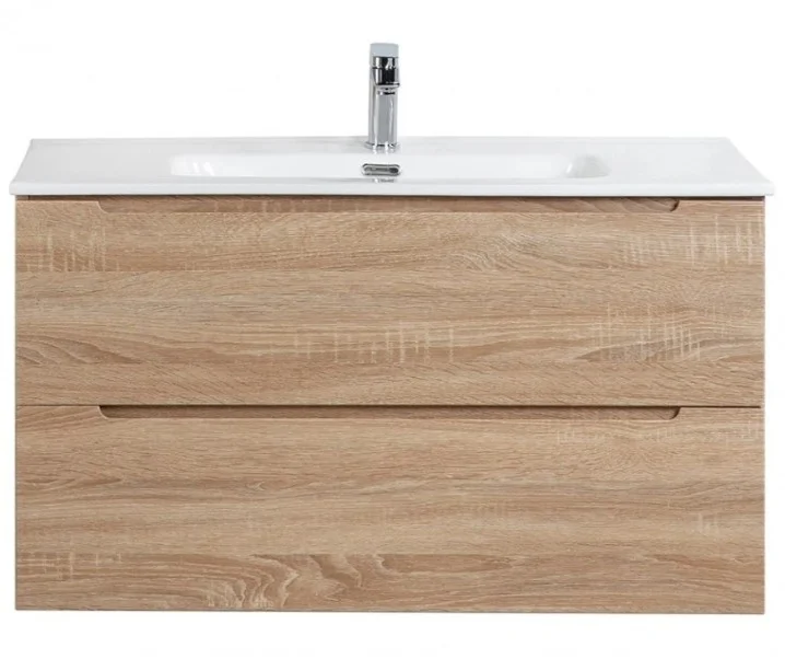 Тумба изготовлена из МДФ ламинированной термо пленкой с текстурой натурального дерева. Раковина выполнена из высококачественной керамики. Мебель оснащена двумя выдвижными ящиками, что обеспечивает удобство использования и дополнительное место для хранения.