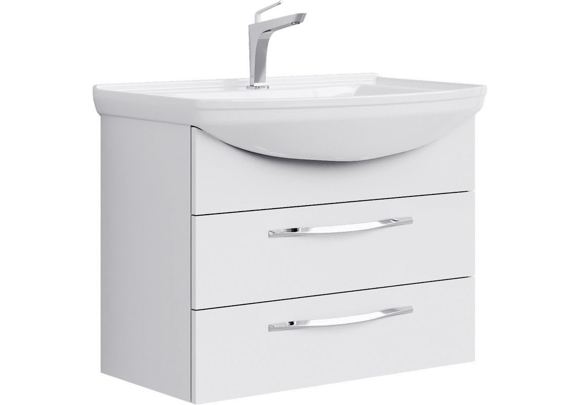 Раковина имеет приятную гладкую поверхность, которая легко чистится. Тумба выполнена из высококачественного материала - МДФ с покрытием из ПВХ-облицовки и крепится к стене на специальных кронштейнах. Алюминиевые ручки на дверцах не только красиво смотрятся на белом фоне, но и легко помогают открывать и закрывать дверцы.
