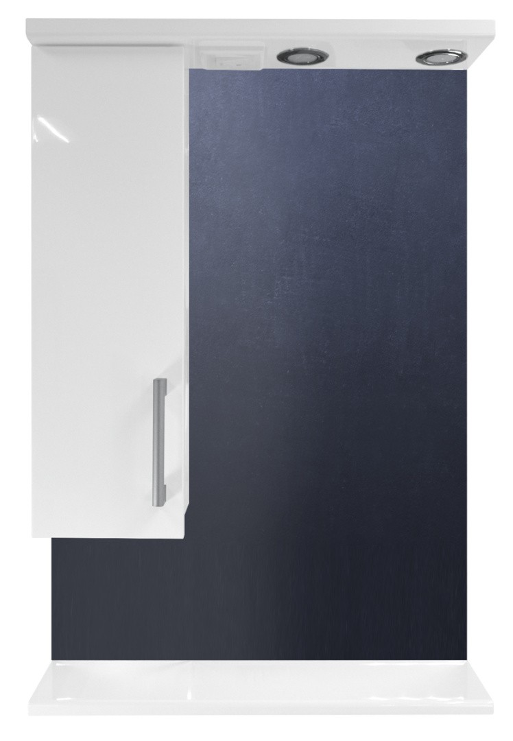 Верхний "горизонт" со светильниками, полочка, фасад и бока крашеные, внутри две полочки. Влагостойкое зеркальное полотно наклеено на ЛДСП 16мм.